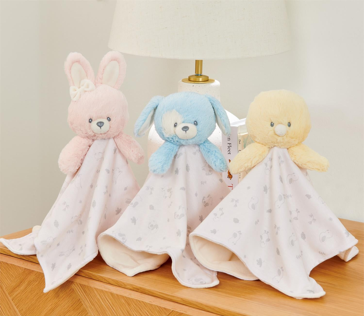 Give baby cuddly, soft comfort wherever they need it with Baby GUND Sustainably Soft Plush Loveys! These beautiful, sustainably made plush loveys combine a super-soft stuffed animal with a double-sided plush security blanket, detailed with a matching simple botanical pattern and soft pastel colors. These soft, durable loveys are also crafted entirely from recycled materials, from the packaging to the stuffing inside- even the shipping bag is sourced from recycled materials! This sustainable lovey collection is convenient not only for on-the-go cuddles or naps, it`s also perfect for complementing a wide array of dŽcor styles for modern bedrooms and nurseries. They make excellent gifts for new parents and adding that extra something to complete a registry gift basket!