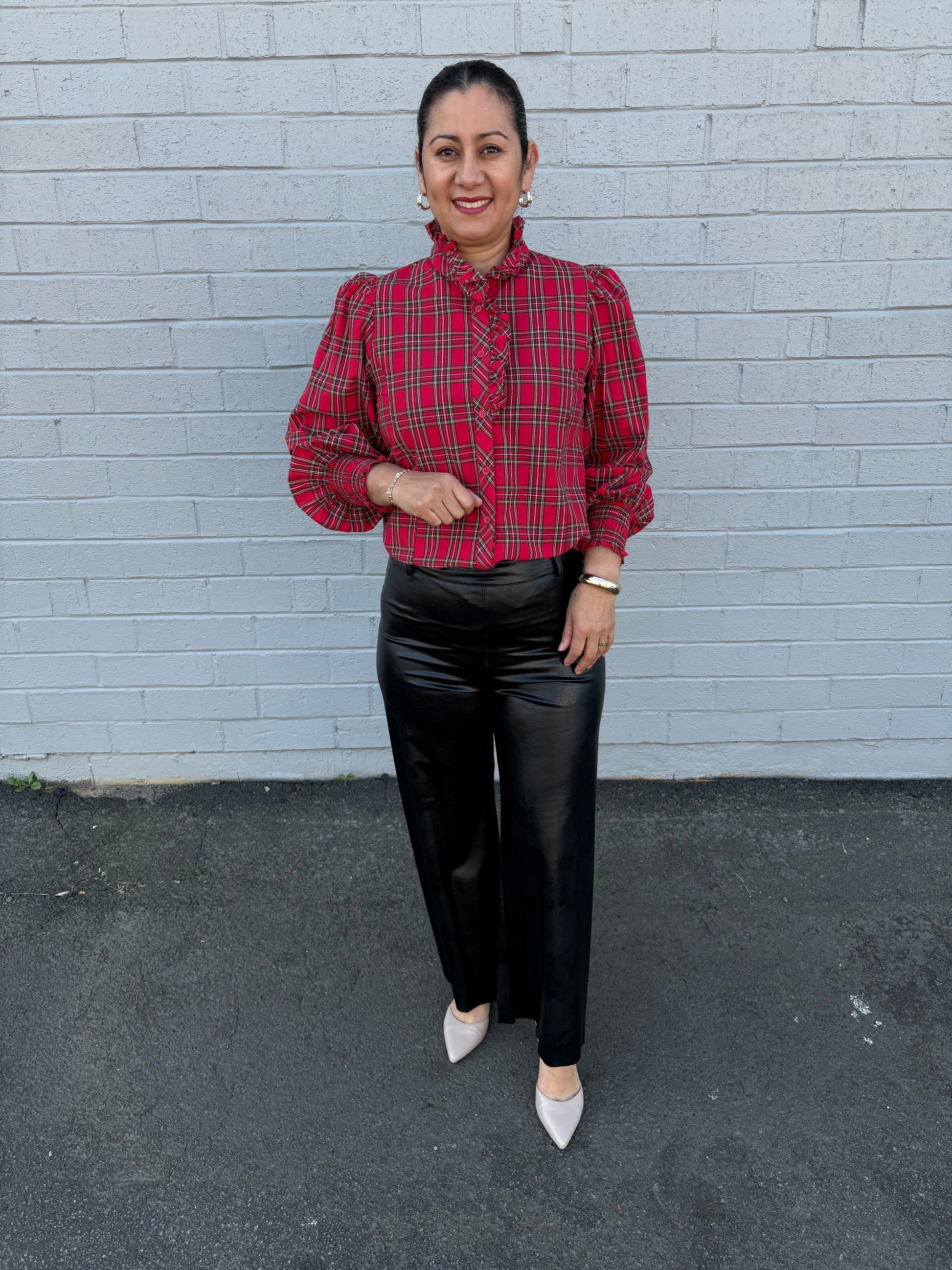 The Aria Top brings effortless sophistication to your everyday wardrobe. This plaid long sleeve blouse features charming ruffle accents along the button-down front and a striking high ruffle neckline that adds instant elegance. Smocked elasticized cuffs provide a polished finish while maintaining comfort throughout your day. Crafted from lightweight woven fabric that's non-sheer and unlined, this versatile piece transitions seamlessly from office to weekend. Perfect for layering or wearing solo, the Aria Top delivers timeless style with modern details that make getting dressed a pleasure.