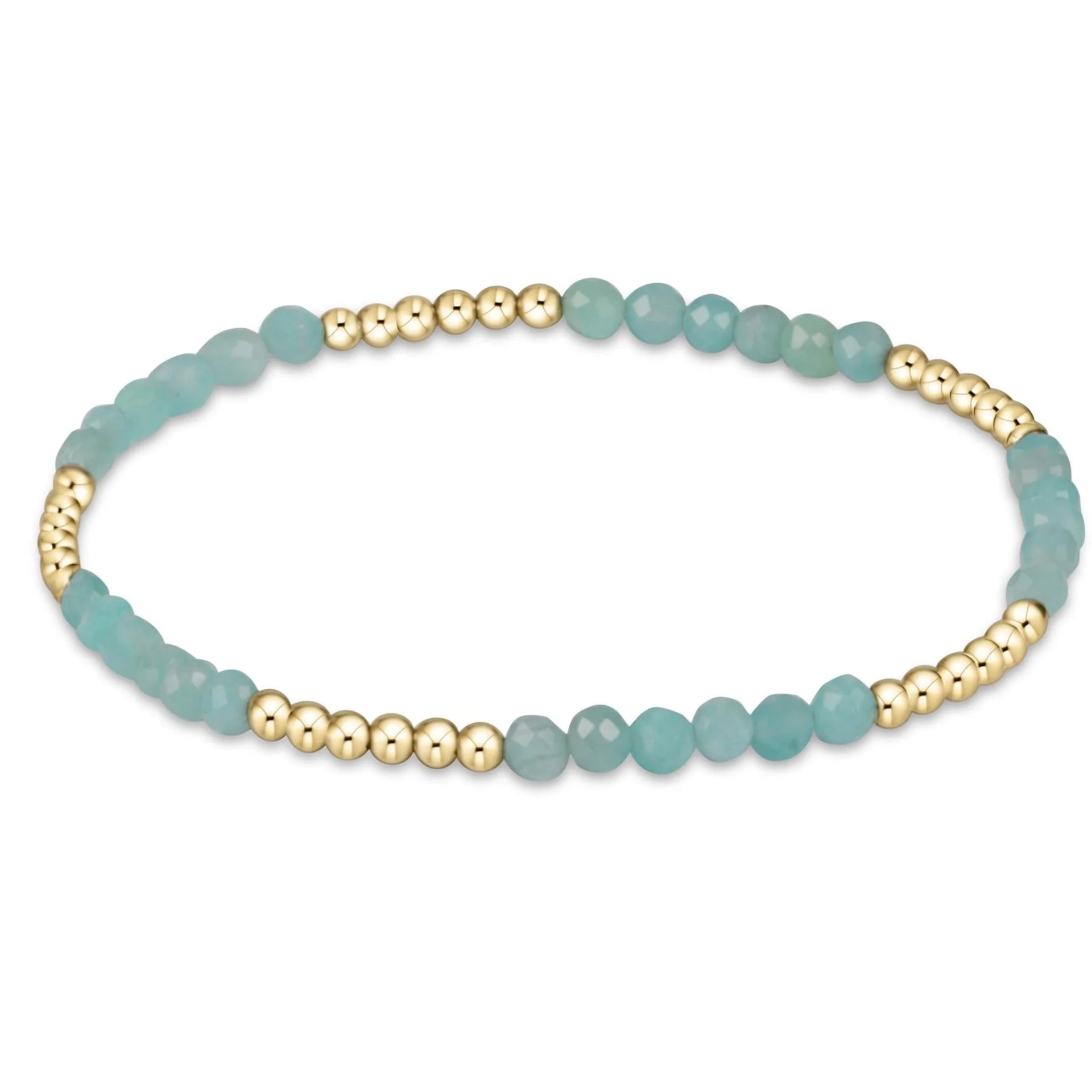 This stunning gold and Amazonite bracelet from enewton is meticulously hand beaded with 2.5mm amazonite gemstones and 3mm 14kt gold-filled beads, creating a luxurious and elegant piece. Made on high performance elastic for a comfortable stretch, this bracelet measures at a standard 6.25" length. Perfect for stacking with other bracelets, this versatile piece will add a touch of sophistication to any outfit.