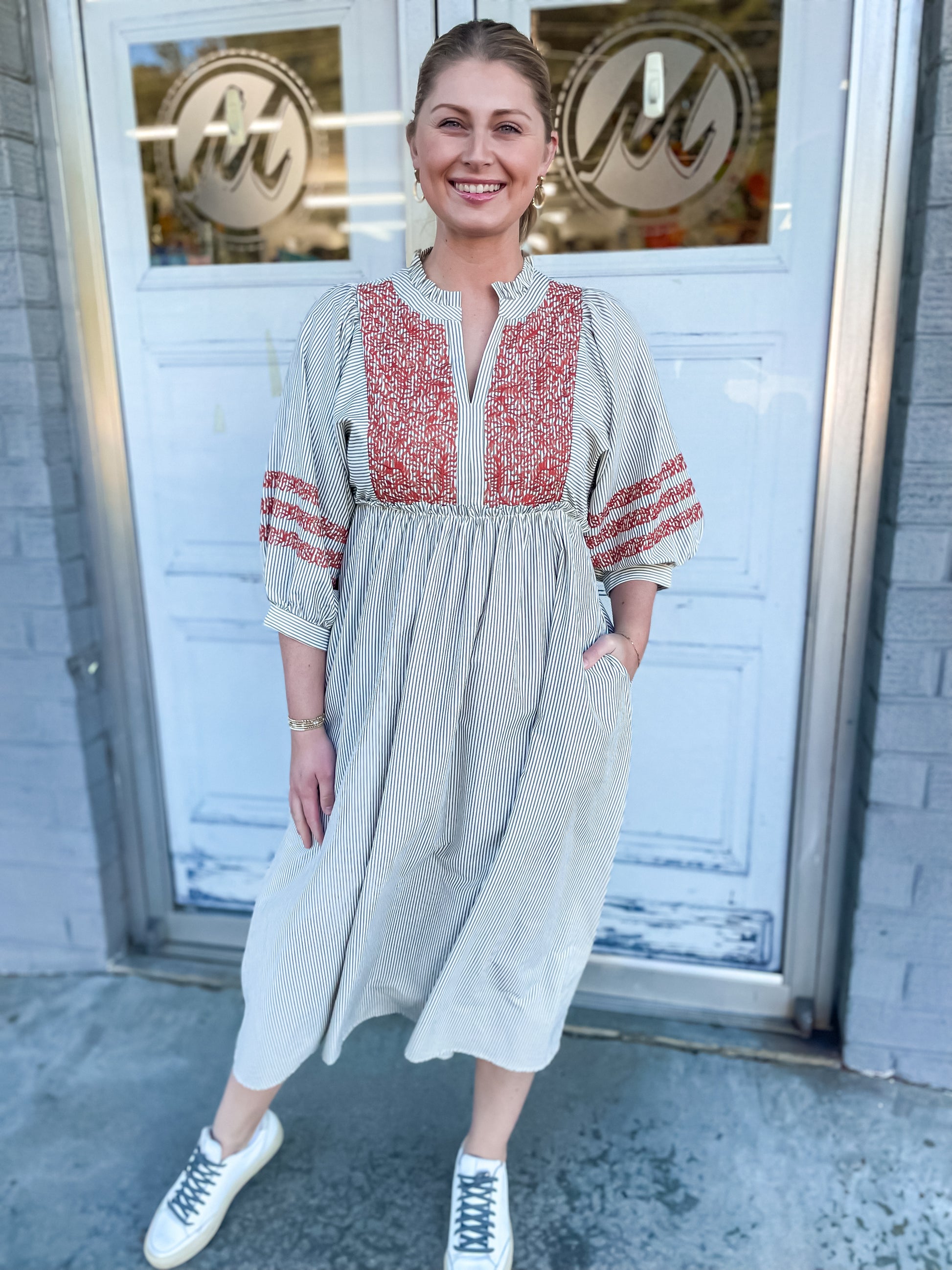 Elevate your style with the Carlee Dress, featuring elegant 3/4 puff sleeves and a flattering midi length. The classic stripe pattern is enhanced by intricate embroidery and a charming ruffled neckline, adding a touch of femininity and sophistication. Perfect for both casual outings and special occasions, this dress combines comfort with standout design to make you feel confident and effortlessly chic.