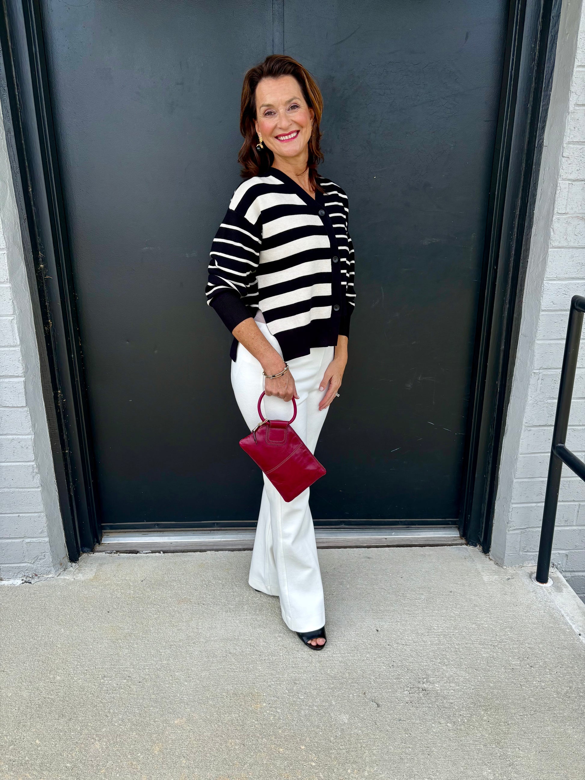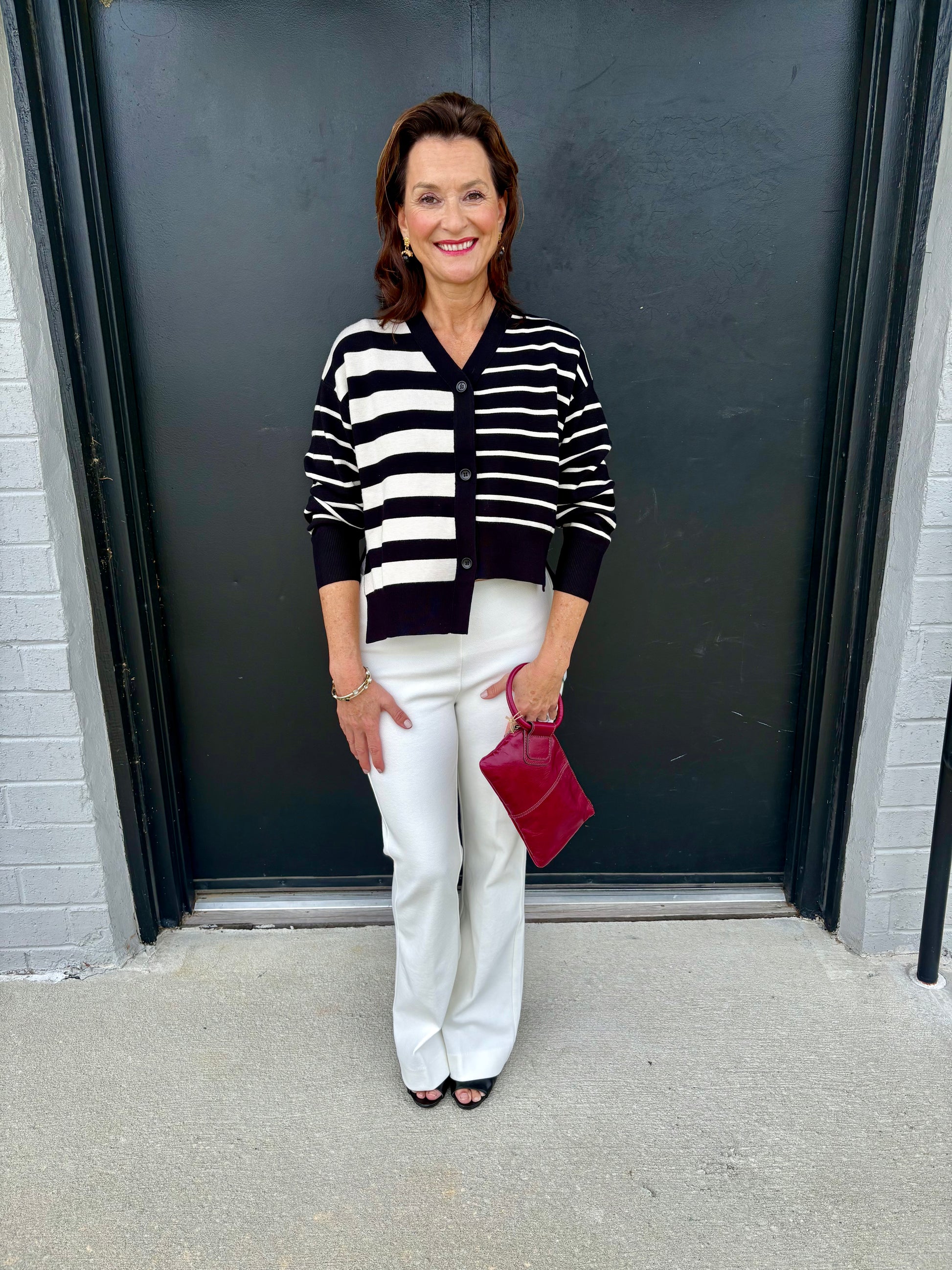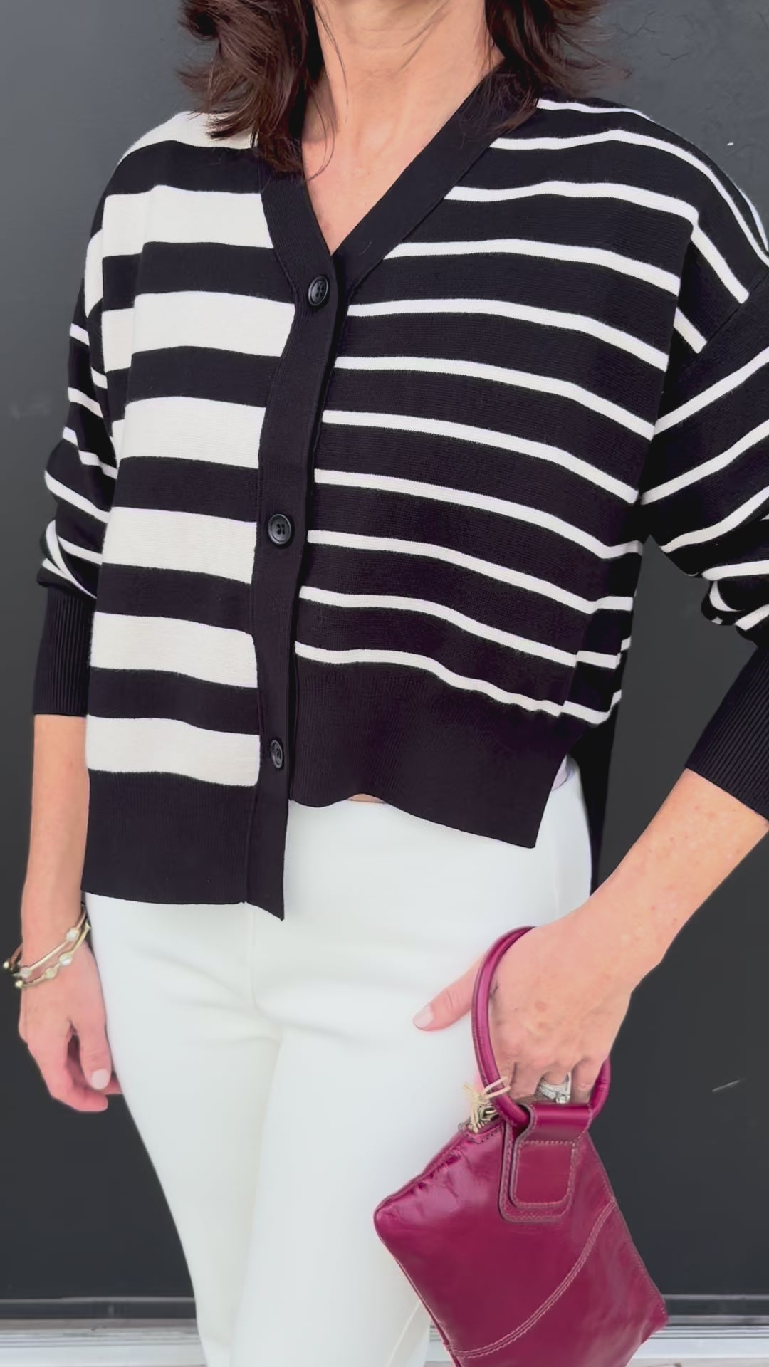 Make a statement with the Elisa Cardigan, featuring bold contrast stripes that add a modern twist to a classic sweater design. This cardigan offers cozy warmth without sacrificing style, making it your go-to piece for layering with any outfit. Perfect for elevating everyday looks with a touch of distinctive flair.