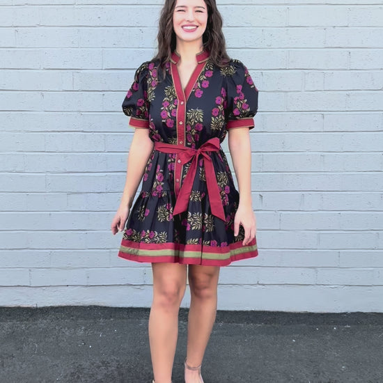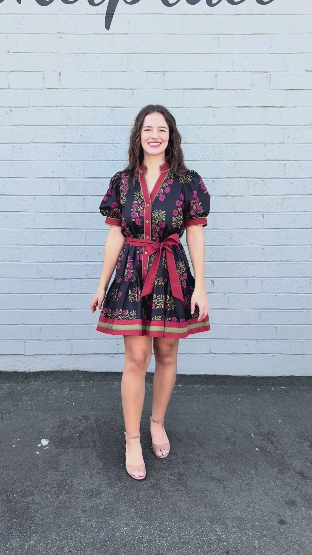 The Elizabeth Dress combines playful charm with effortless style. Featuring a floral pattern, short puff sleeves, and a ruffle hem, this lightweight woven mini dress brings a fresh, feminine vibe. Its V-neck with band collar and button closure add subtle sophistication, while the removable belt highlights your silhouette. Practical side pockets and a fully lined, non-sheer design ensure comfort and confidence. Perfect for warm days, this dress blends colorful accents with functional elegance to elevate your wardrobe.