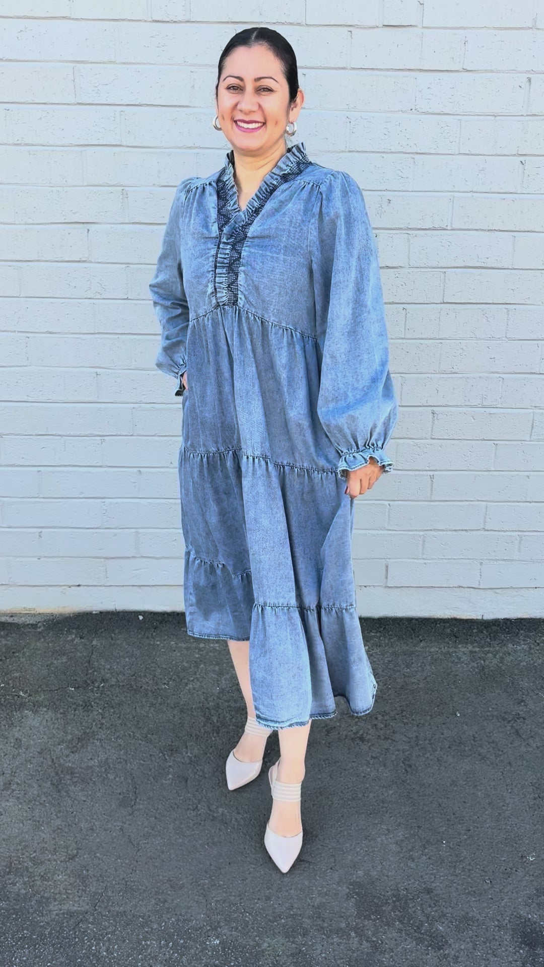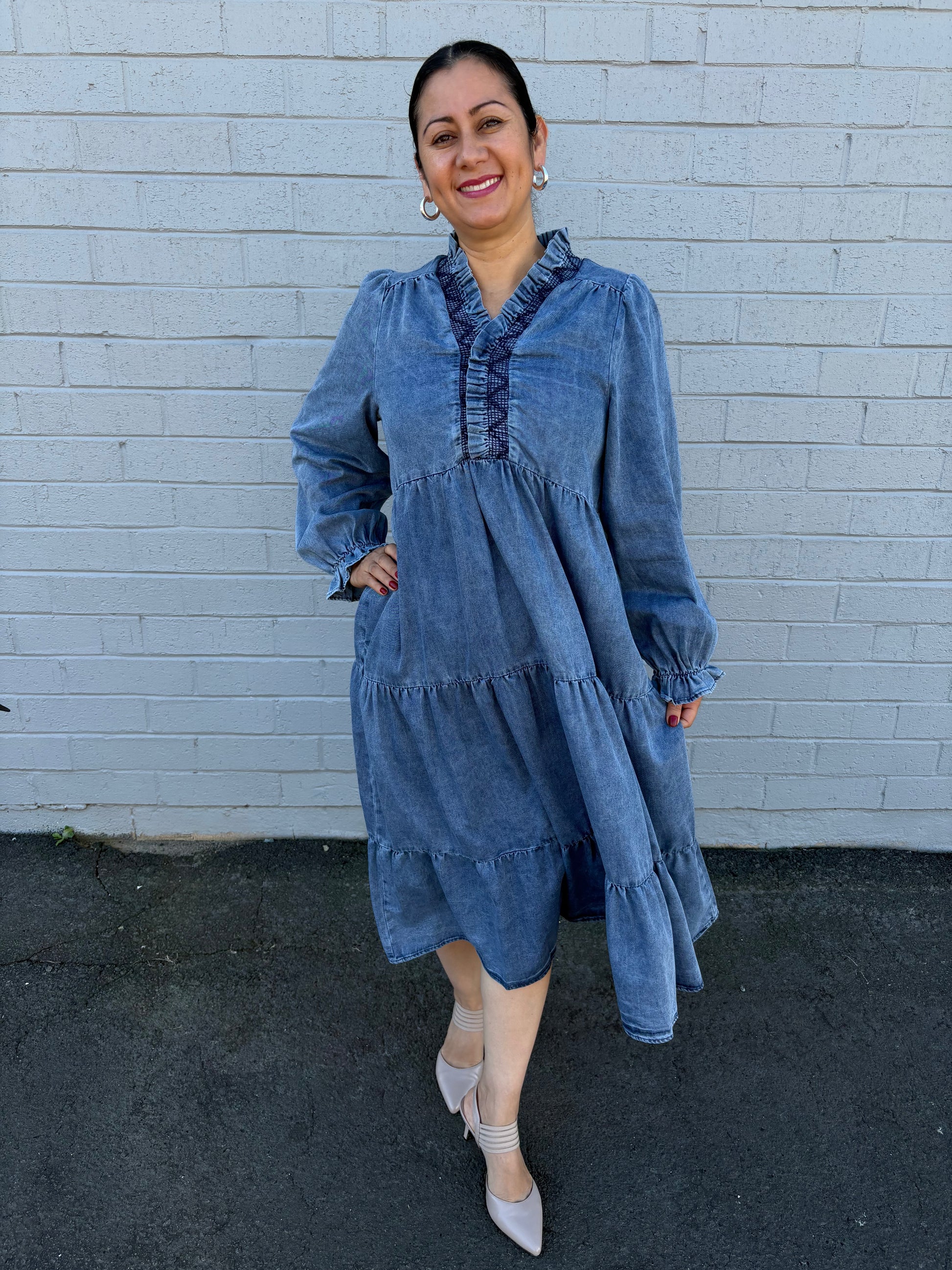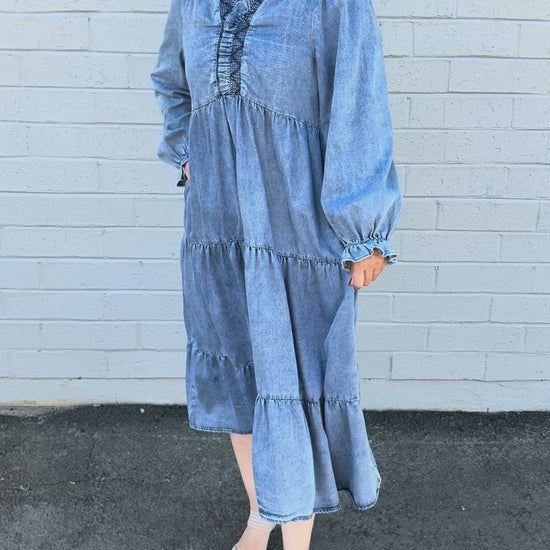 The Gwen Dress combines vintage charm with modern comfort through its washed denim fabric and smocked neckline. Its tiered design adds a flowing silhouette that moves gracefully with you, making it ideal for casual outings or weekend getaways. This dress offers effortless style and comfort, perfect for those who want to look polished without sacrificing ease.