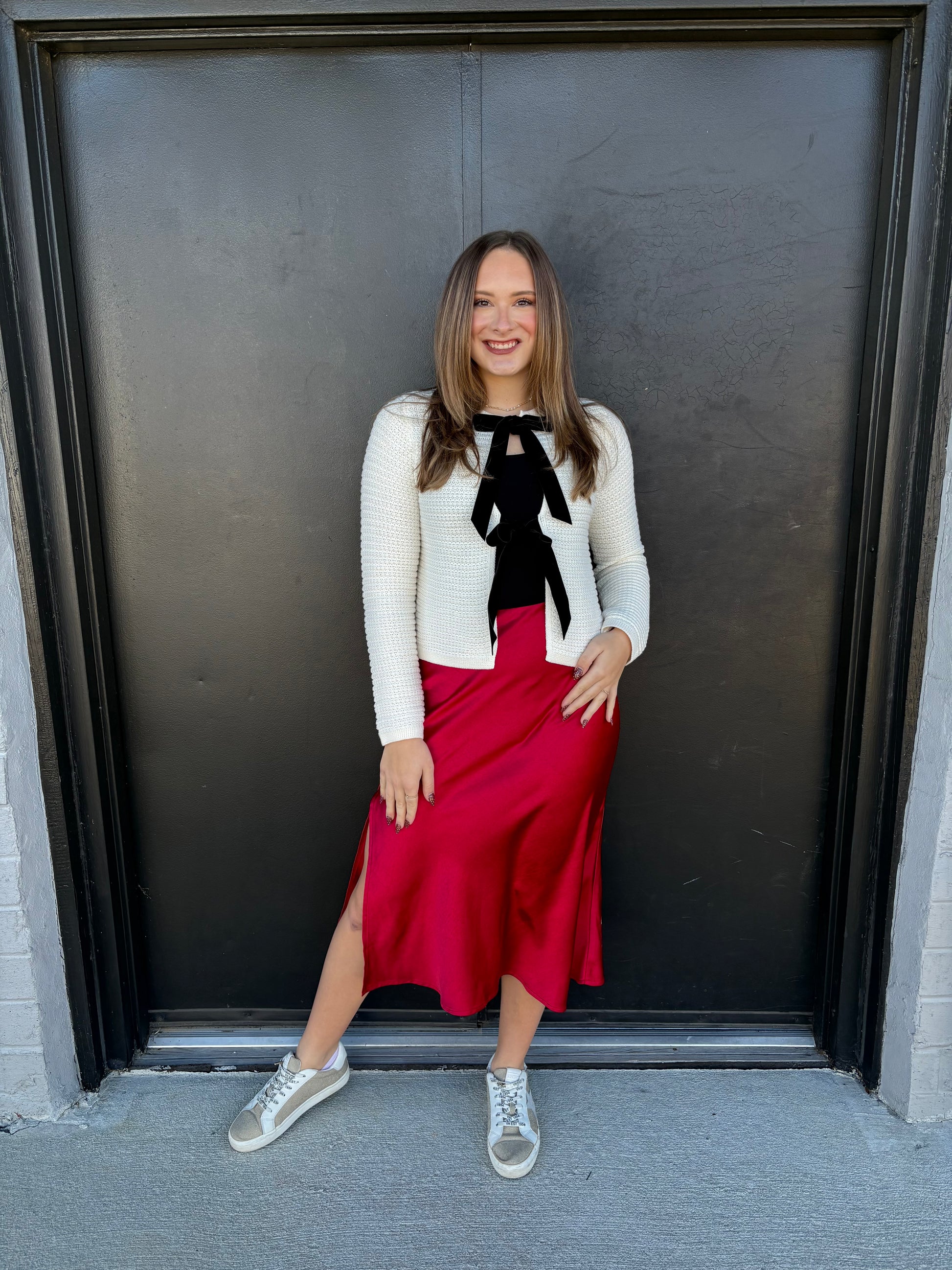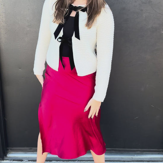 Elevate your wardrobe with the Kamille Cardigan—a ribbed knit sweater featuring a luxurious velvet front bow tie detail. This elegant cardigan combines comfort with sophistication, making it perfect for layering on cooler days or dressing up any outfit effortlessly. Soft, stylish, and versatile, the Kamille Cardigan brings timeless charm and cozy warmth to your everyday look.