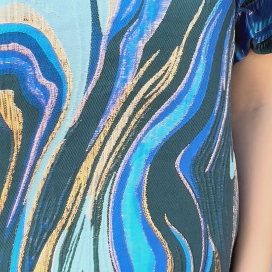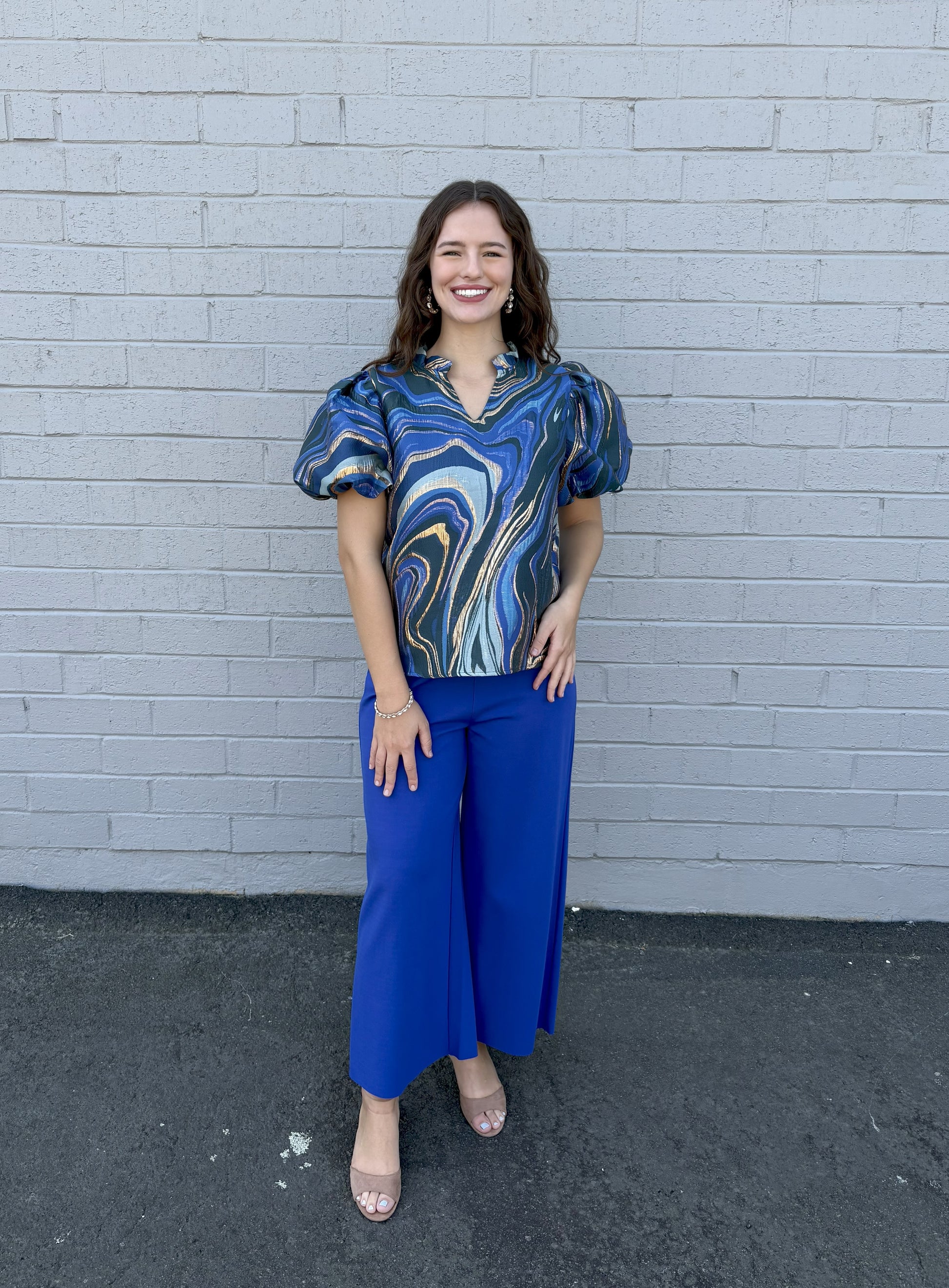 The Kenna Top features short puff sleeves and a playful ruffled neckline, crafted from multi-colored abstract jacquard fabric. Its textured design adds depth and visual interest, making it an eye-catching choice for any occasion. This stylish piece combines comfort and charm, perfect for elevating your everyday look with effortless flair.
