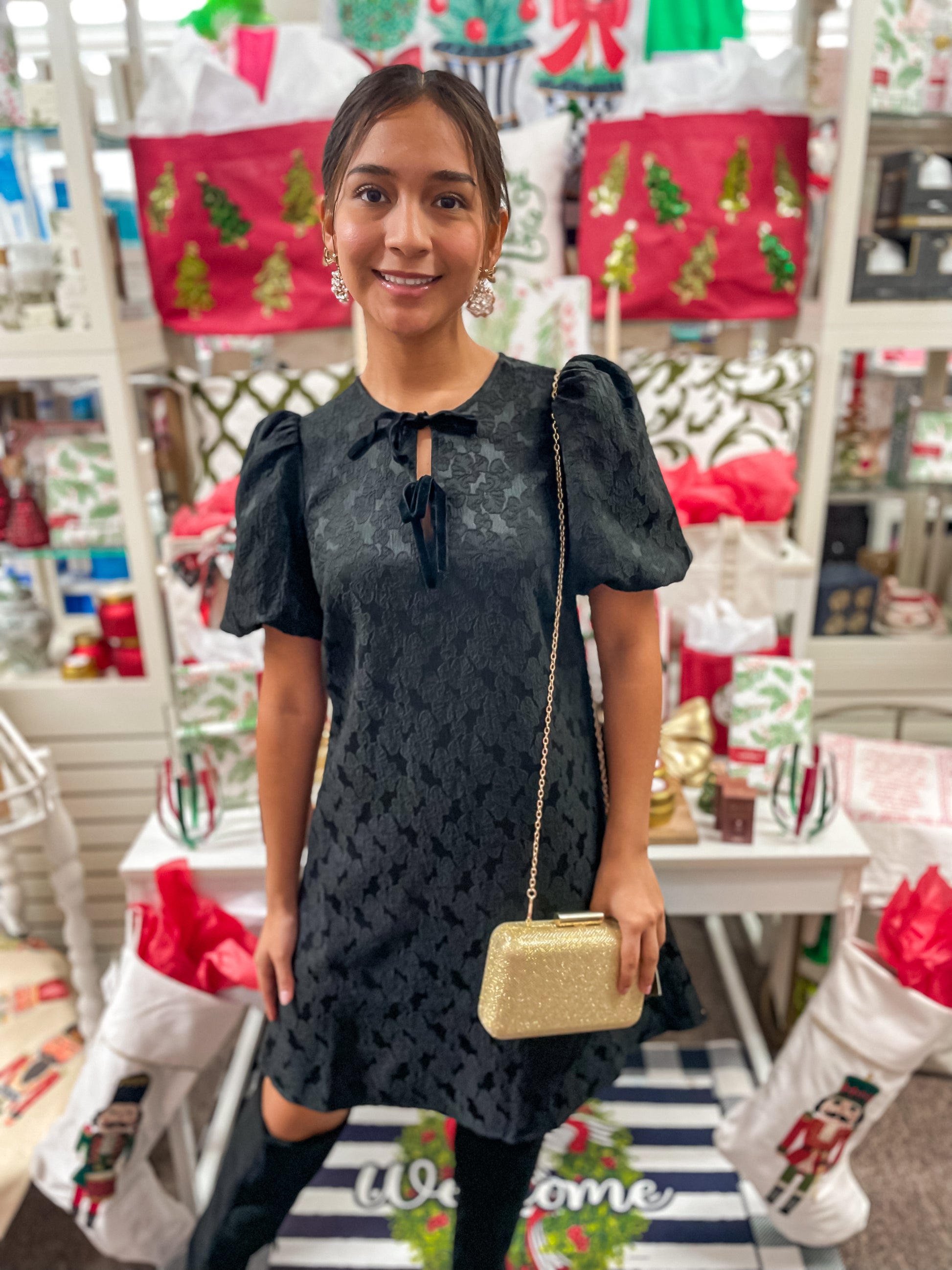 The Lana Jet Black Dress transforms any occasion into an unforgettable moment. This luxurious brocade creation features charming short puff sleeves with elastic cuffs and delicate velvet tie accents that add dimension and sophistication. The flattering straight silhouette skims your figure beautifully, while the rich texture of the brocade fabric ensures you'll turn heads. Whether you're attending a wedding, gala, or special celebration, this statement piece delivers timeless elegance with modern flair. Elevate your wardrobe with a dress that's as memorable as the moments you'll wear it.