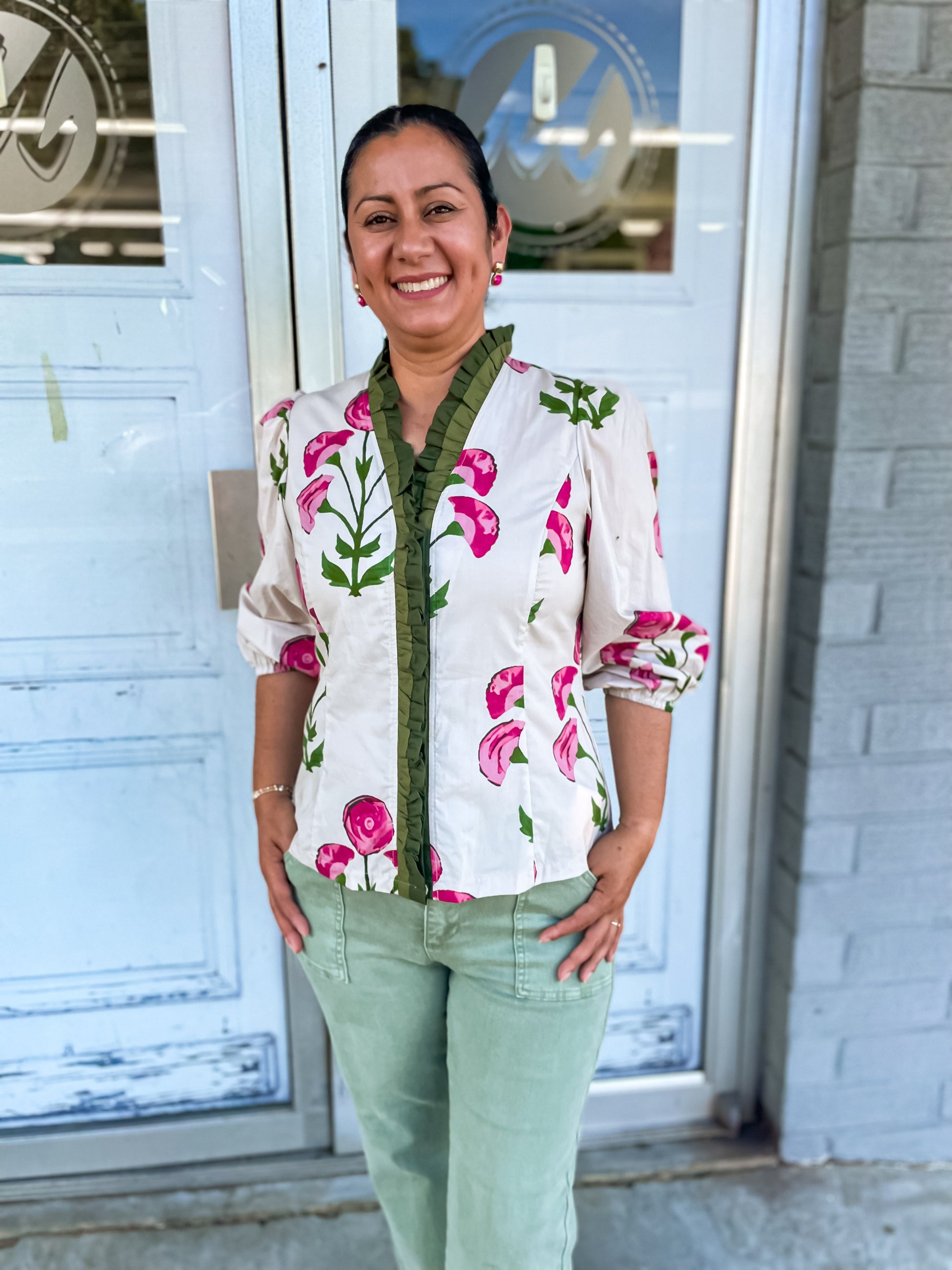 Elevate your wardrobe with the Navie Top, featuring a delicate floral print and charming ruffled neckline. Designed without lining for a breathable, lightweight feel, it offers comfort alongside style. The subtle contrast detail adds a unique touch, making this top perfect for both casual outings and dressier occasions. Experience effortless elegance and standout appeal with the Navie Top.