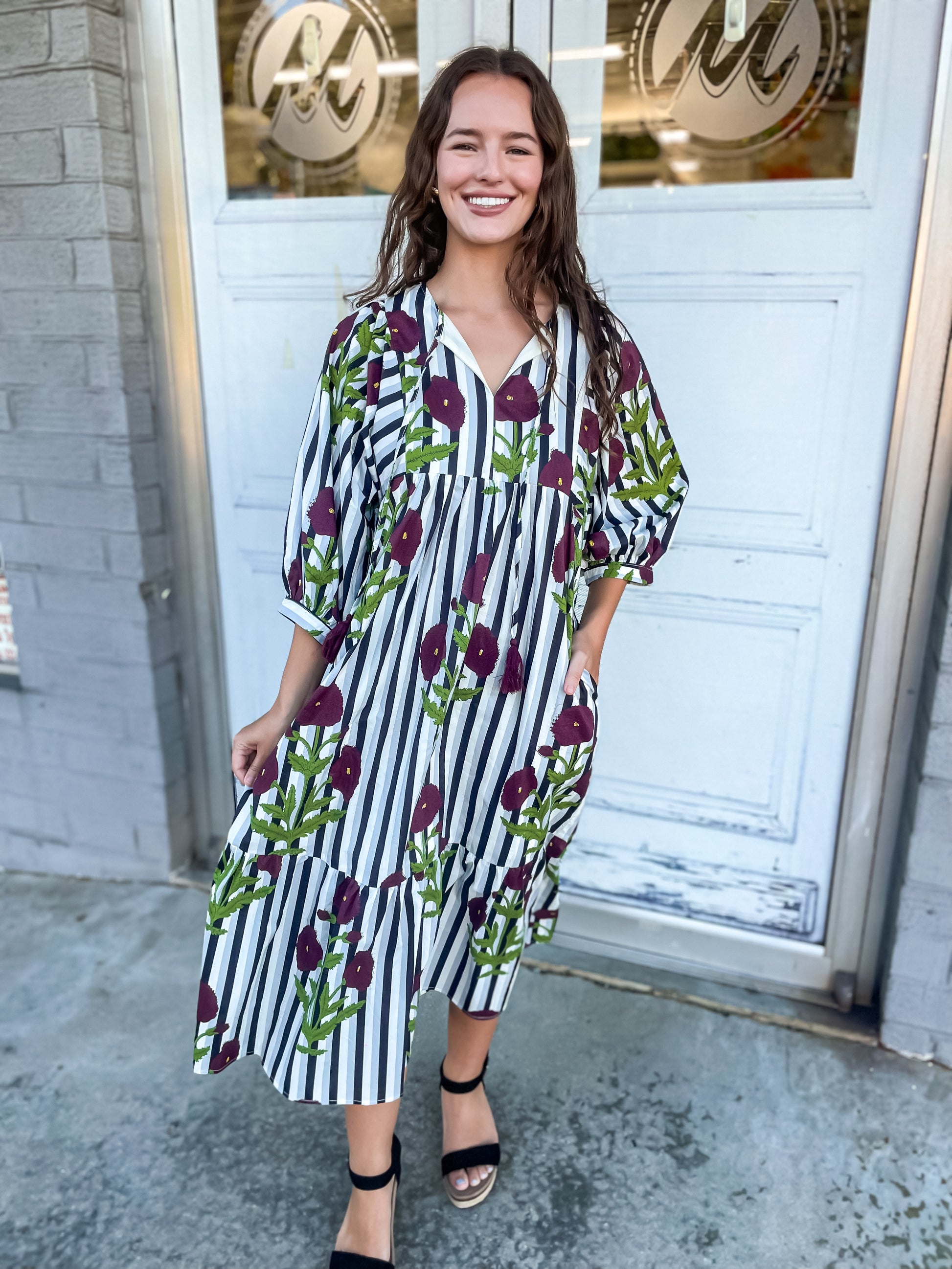 Embrace effortless elegance with the Taby Dress, featuring a charming striped puff sleeve design and a delicate allover floral print. Its split neck with tassel ties and partial button placket add subtle, stylish details, while convenient side pockets blend fashion with function. Fully lined and crafted from lightweight woven fabric, this non-sheer midi dress offers comfort and flattering coverage—perfect for any occasion where you want to look and feel your best.