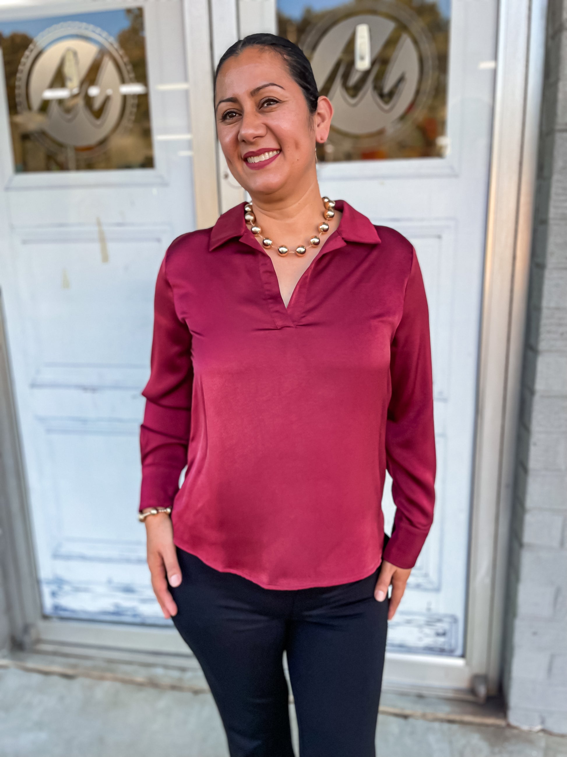Elevate your wardrobe with the Terry Top, crafted from smooth satin for a luxurious feel. Its fluid pull-on design and relaxed drape ensure all-day comfort, while the notched collar and button cuffs add subtle sophistication. The curved high-low hem with side slits creates graceful movement, making this blouse perfect for effortlessly transitioning from daytime elegance to evening chic.