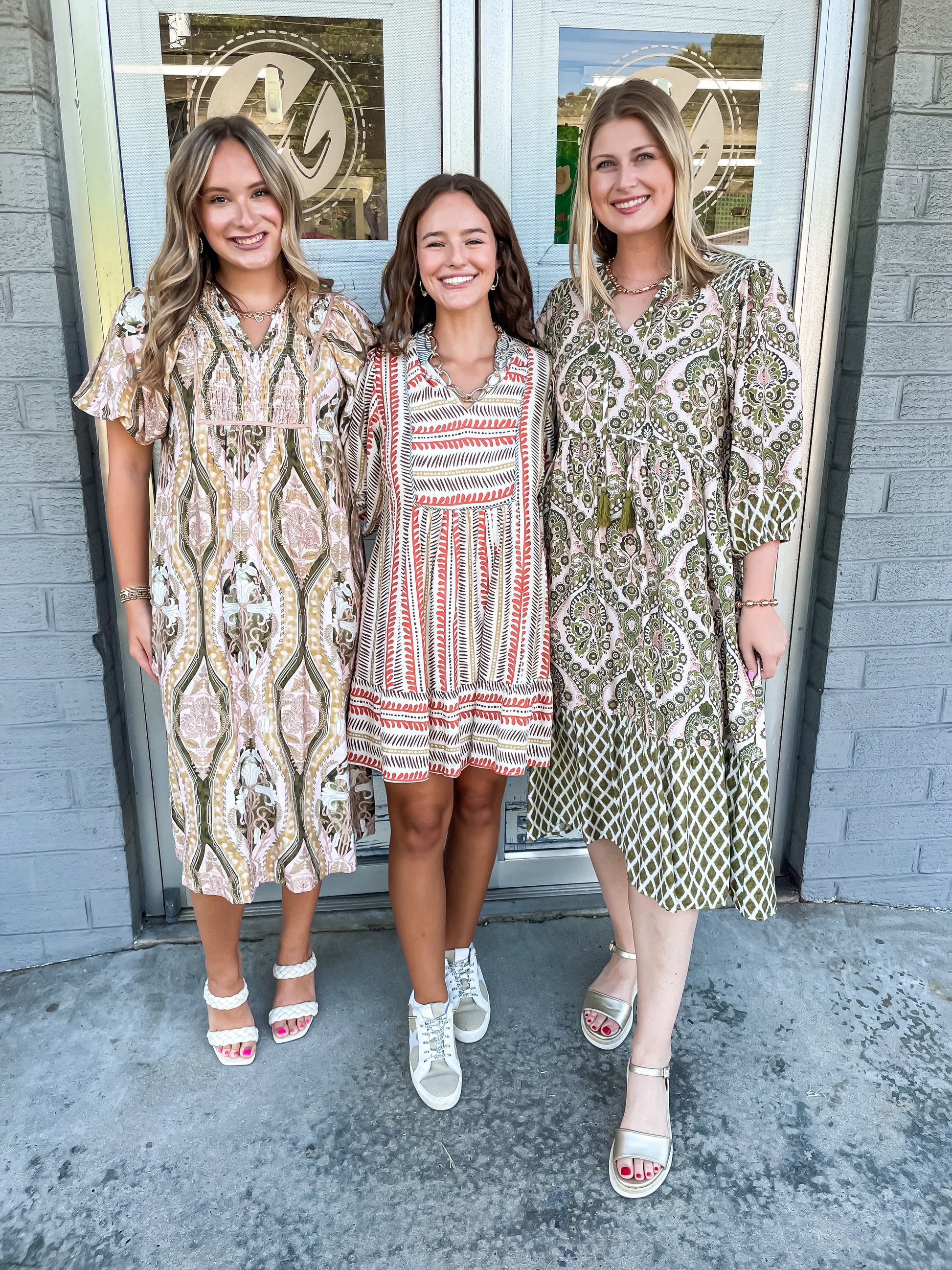 Elevate your style with the Uptown Dress, featuring a flattering V-neckline and eye-catching abstract print. The smocked yoke ensures a comfortable, tailored fit, while contrast piping adds a chic touch. Short balloon sleeves bring a playful, feminine flair, making this midi dress perfect for both casual outings and special occasions. Embrace effortless elegance and stand out wherever you go.