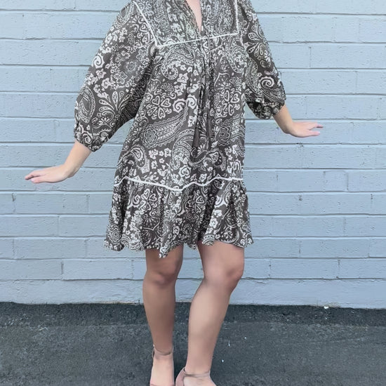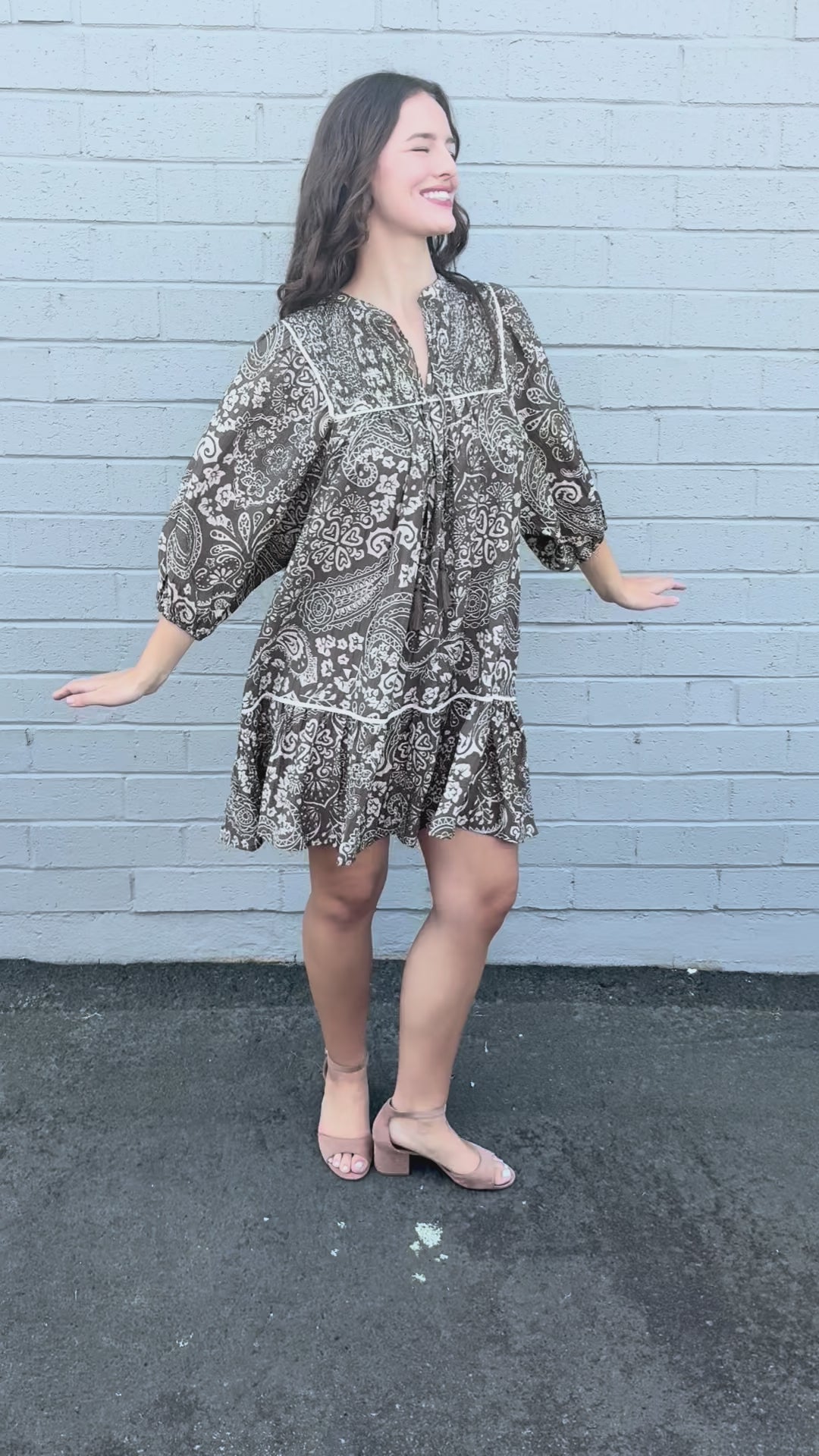 Embrace effortless style with the Verity Dress, featuring an allover paisley and floral mix print that captures a timeless, bohemian vibe. The split neckline with tassel ties adds a playful touch, while the smocked yoke ensures a comfortable, flattering fit. Perfect for any occasion, this dress combines charm and ease to elevate your wardrobe.